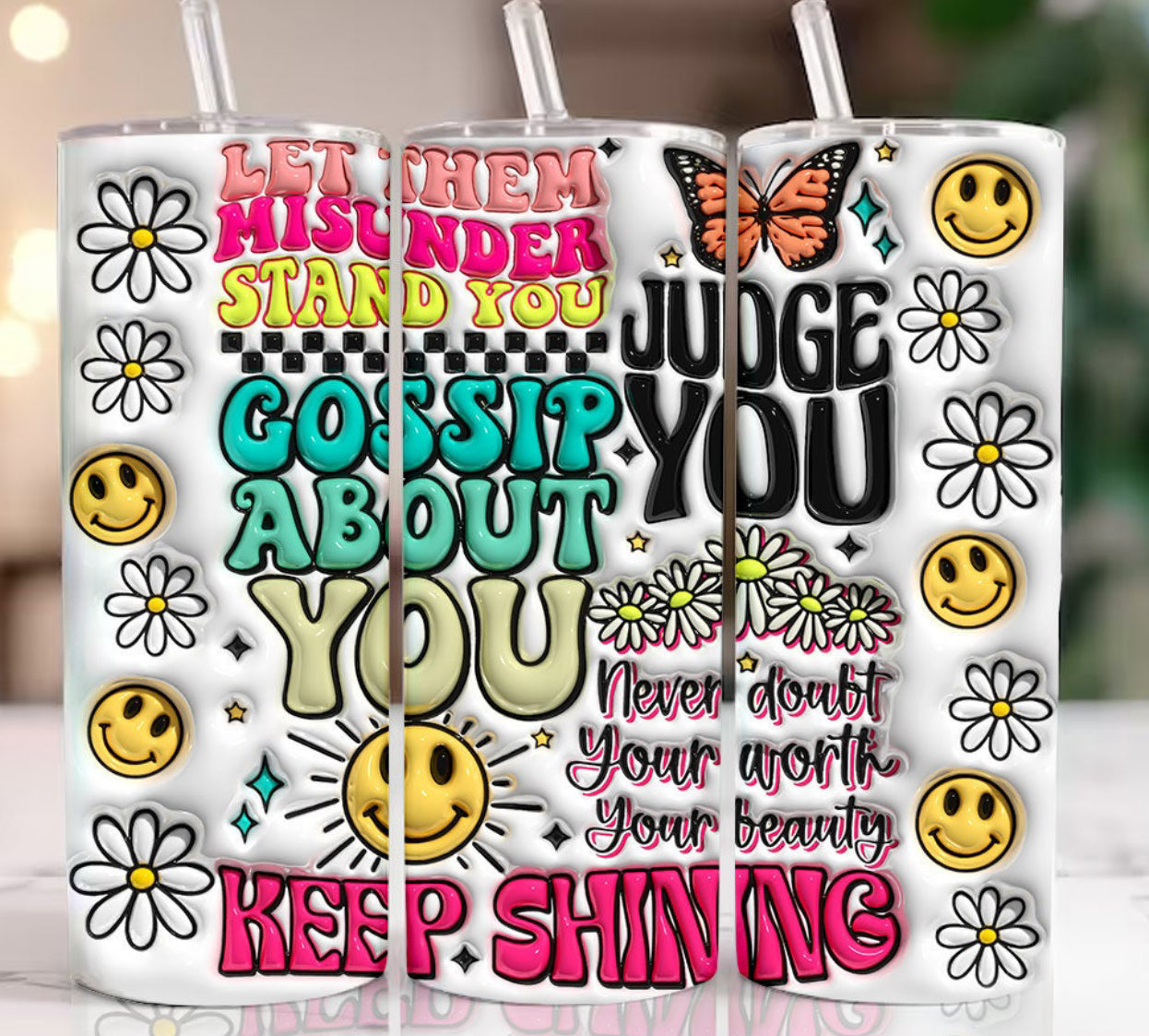 20 ounce tall, Skinny tumbler, vacuumed insulated, double walled stainless steel tumbler. Keeps drinks hot or cold for hours. These are SUBLIMATED (heat printing process) , not epoxied. - This is an image sublimated on the cup. (NO GLITTER/NO PAINT) THERE IS NO PHYSICAL GLITTER OR PAINT ON THIS CUP